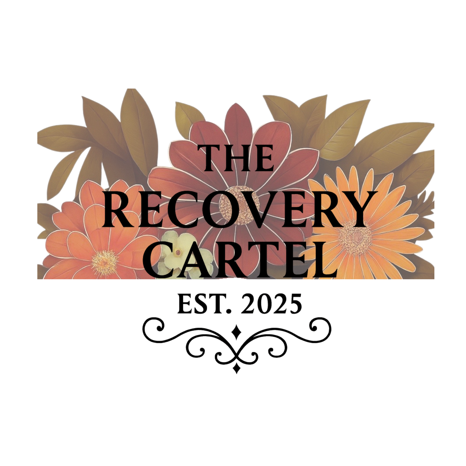 “The Recovery Cartel – Est. 2025” stands boldly at the centre, a reminder that every ending gives rise to a new beginning. The floral crown behind the words embodies renewal, community, and the shared journey of rebuilding from the ground up.